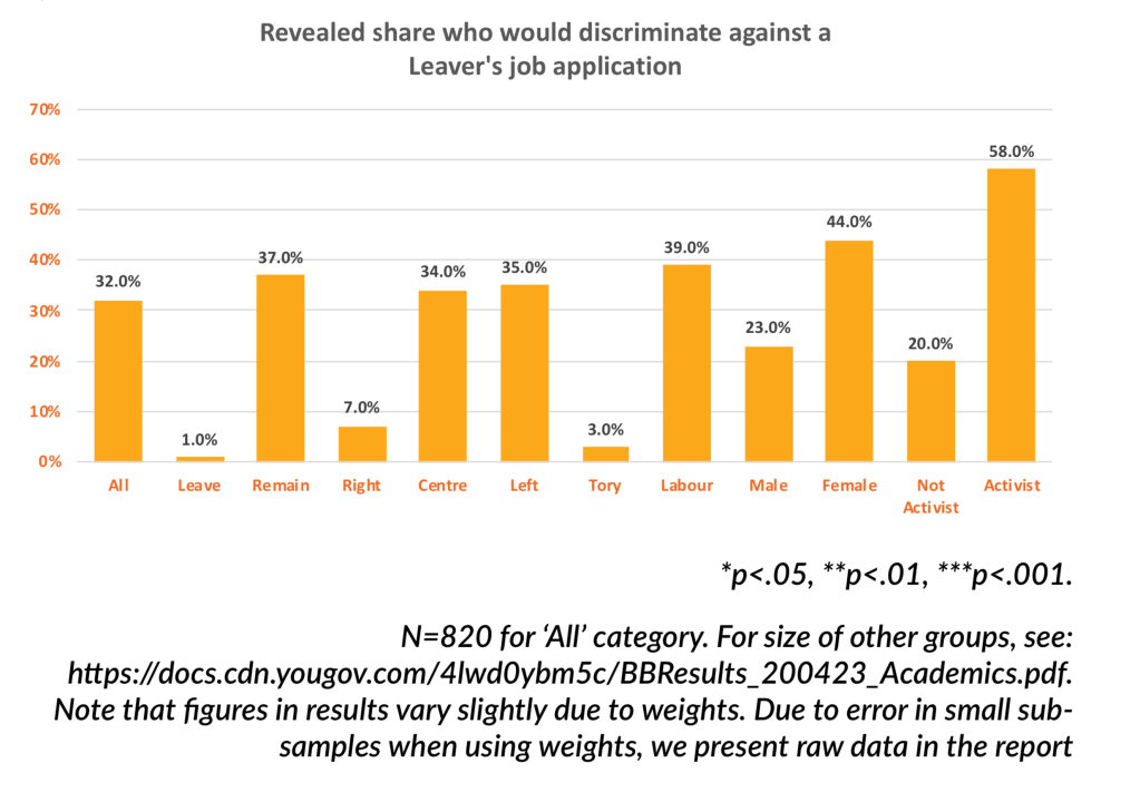 However, the part of the report that interested me the most, glossed over by most commentators, compared male and female academics and their willingness to discriminate against a job application from a candidate with different political beliefs. If you look at the figure below taken from the Policy Exchange report it appears they are twice as likely to as their male colleagues to discriminate against someone holding different political beliefs – in this case supporting Leave.