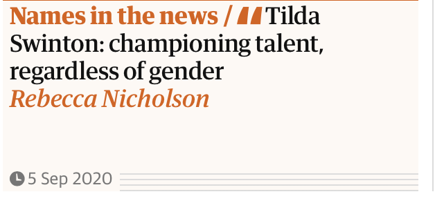5th September Tilda Swinton- Championing Talent Regardless of Gender. Pretty much standard Guardian fare and nothing original. Certainly doesn’t belong on the mens page.