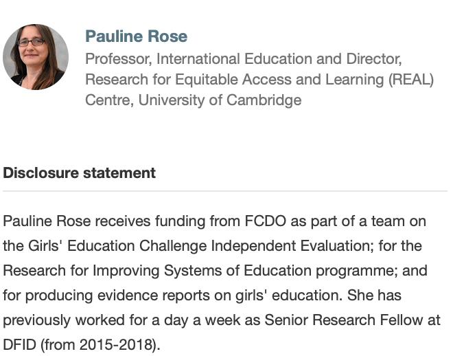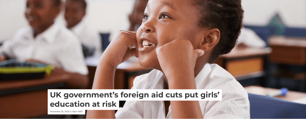 The UK government is considering cuts to its foreign aid budget. Personally, I think that is is a mistake but you can argue for and against this move. Pauline Rose in an article in The Conversation does something different and turns it into an argument about gender, suggesting that the cuts will put girls’ education at risk. The article produces no evidence that education, in particular, will be put at risk or that the cuts will be specifically affect girls.