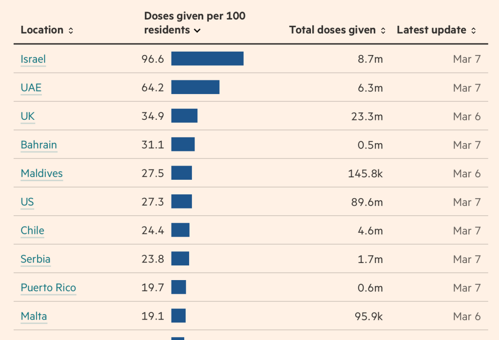 If you look at the top 10 performers in terms of vaccination rate. All but one of these counties (Serbia) are run by men. See the table on the left taken from the Financial Times Covid-19 vaccine tracker.