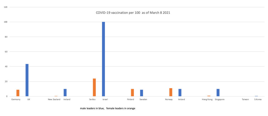 A lot of water has flowed under the bridge since August 2020 and the most important development has been the emergence of several effective vaccines. Now, a good criterion for evaluating leadership is e how effectively they have rolled out vaccination to the population of their countries. I thought a good place to start might be using the original pairings of Garikipati and Kambhampati. Unfortunately, their paper is not clear on the actual pairings used and you have to rely on their account in secondary sources such as The Conversation or The Guardian. For example, New Zealand was twinned with Ireland, Germany with the UK, Sweden with Finland, Bangladesh with Pakistan, Hong Kong with Singapore, Serbia with Israel, Norway with Ireland and Taiwan with S.Korea. When you list the data like this it looks frankly laughable. And it is. The bar chart below shows the rate per 100 of the first COVID-19 vaccination for the paired countries listed above. You will see by and large that those countries with male leaders have done better in rolling out vaccines. The UK is well ahead of Germany, Israel has eclipsed Serbia and Jacinda Adhern is frankly an ‘also-ran’, only 0.2 per hundred have been vaccinated in New Zealand.