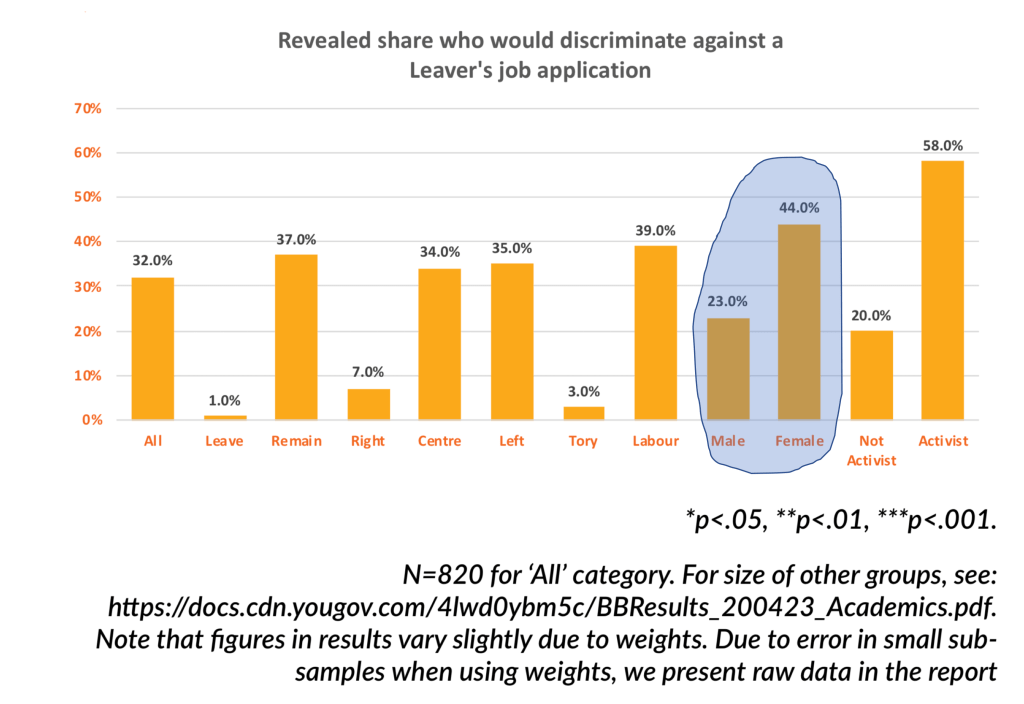 There is also evidence of toxic feminity in academia. For example, the Policy Exchange Report – Academic Freedom in the UK revealed a disturbing state of affairs in our institutions of higher learning where left-leaning academics predominate. The report revealed that academics, in general, are prepared to openly discriminate against colleagues with a different point of view. What the figures also showed was that female academics were twice as likely as their male colleagues to support discrimination against a leave-supporting academic in a job application (see figure below). Once gain, toxic femininity?