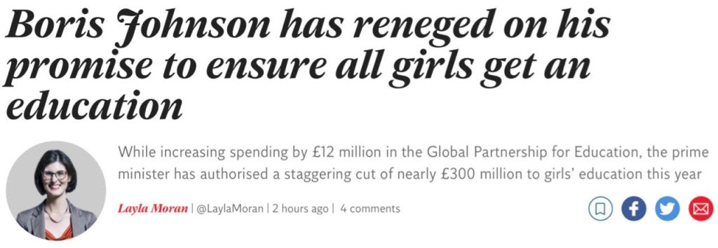 Layla has just published an article in The Independent, Boris Johnson has reneged on his promise to ensure all girls get an education that you can find by clicking the screenshot below.
