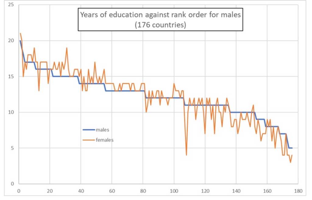 You will also see from the figure above that there are some countries where both sexes receive too little education but the boys receive even less. You wouldn’t know this from the narrative in the media and selectively concentrating on the education of girls would further increase the disparity in those countries.