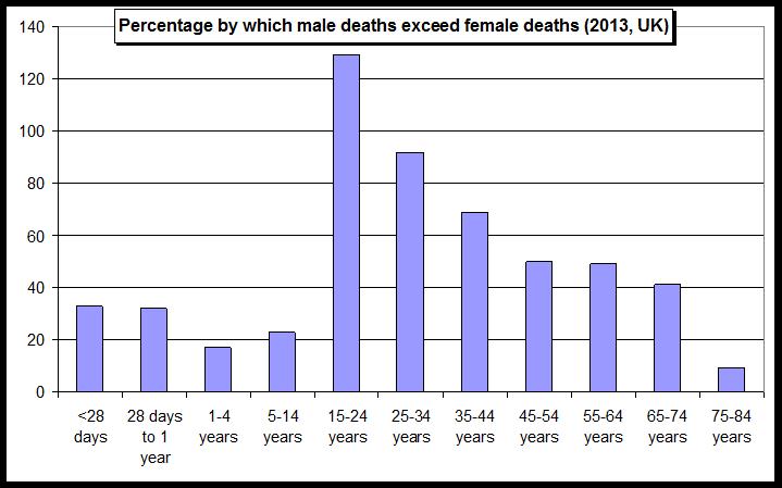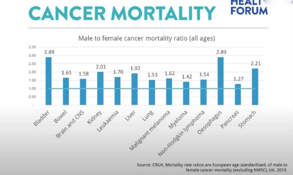 Similarly for cancer, though most charity fund raising and screening services are focused on female cancers, men are more likely to die from almost cancers that affect both sexes. There is, once more, a gender death gap.