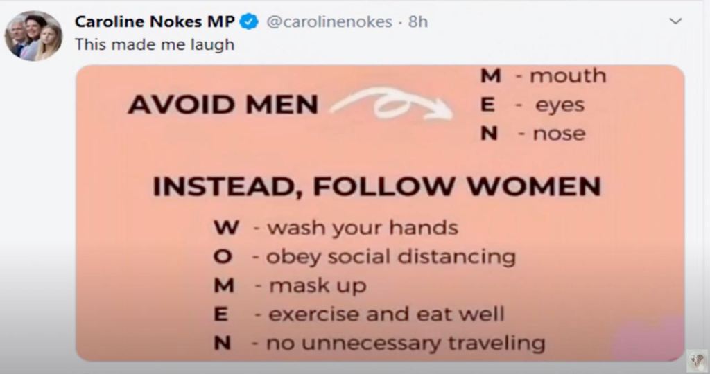 If you look at deaths from COVID19 among health care workers, 95% of deaths among doctors were men even though they comprise 55% of the workforce and among nurses 55% of deaths were among men although they comprise 10.5% of that workforce. Caroline Noakes, who is the Chair of the Women and Equalities Commission of the UK Parliament, at a time when many men were barely cold in their graves, sent the tweet below. This might have acceptable from an immature teenager but not form an elected representative with an equalities brief.