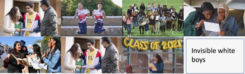 Looking at the reporting of A level and GCSE results in newspapers and the BBC online reveals something important and disturbing. Boys in general but particularly white working-class boys are being completely erased from the narrative. The message that is being given out is that education is not for them and they do not matter. Take, for example, the article that appears in BBC bitesize How to Manage Results Day: Six tips for parents. The article is pretty anodyne but the choice of pictures tells a different story. There are five photographs but not one white boy (working class in particular).