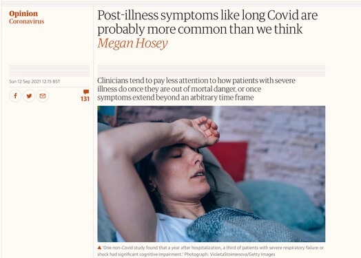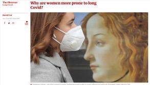 Observer (Sunday equivalent of the Guardian) 13th June 2021. Observes that women are four times more likely to get long Covid but they are also more likely to get other disorders of questionable reality such as chronic fatigue syndrome, fibromyalgia and chronic Lyme. The author notes that these disorders have been ridiculed by sectors of the medical community as forms of hypochondria.