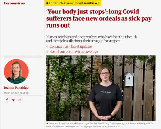 Returning to Long Covid, what almost all of these articles had in common is that they were written by female journalists and foregrounded pictures of young women – the group who are least likely to be severely affected by Covid. For examples of this genre click on the images below.