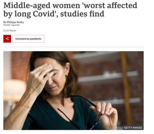 It has been noted by others that Long Covid doesn’t appear to be a problem in other countries such as Italy, South Africa and the USA. Indeed, a recent article in the Times asked Why is Britain now is the world capital of Long Covid? (see here). The answer, in part at least, is that it has been driven by journalists with an agenda, determined to keep female victimhood in the foreground.