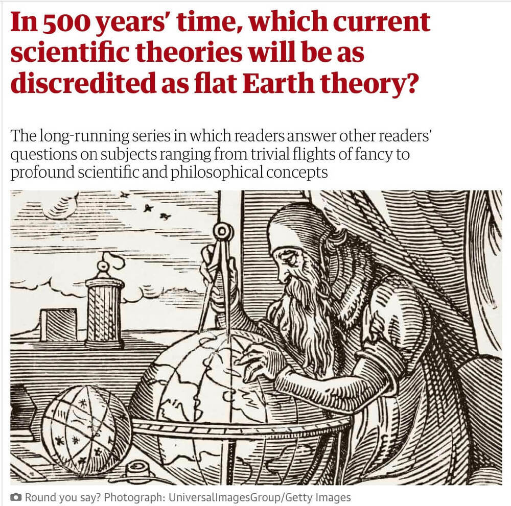 The article below appeared in the Guardian of 13th December 2021. It was a nice piece inviting readers to speculate on the theories that will be as discredited as flat-earth theory is now, in 500 years time. Click the image to see the article.