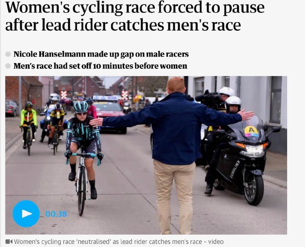 So what made it newsworthy? According to the BBC online and The Guardian, Nicole Hanselmann leader of the women’s race that had started 10 minutes after the men’s race, caught up with the male competitors and had to wait until the men could re-establish the gap. There was predictable feminist outrage on social media. One commonly poised question was ‘why wasn’t the men’s race paused to allow the women to pass?’. Similarly, commentators argued that this was just another example of the patriarchy supporting fragile male egos and holding women back.