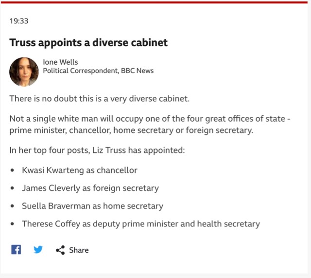 It seems that at the BBC, diversity is now defined by the absence of white men. The caption on the left, written by Ione Wells, appeared on the rolling news section of the BBC online on 6th September. The new Prime Minister of the UK, Liz Truss, had announced her four key cabinet positions and Ione was clearly delighted to find that it did not include a single (hawk, spit) white man.