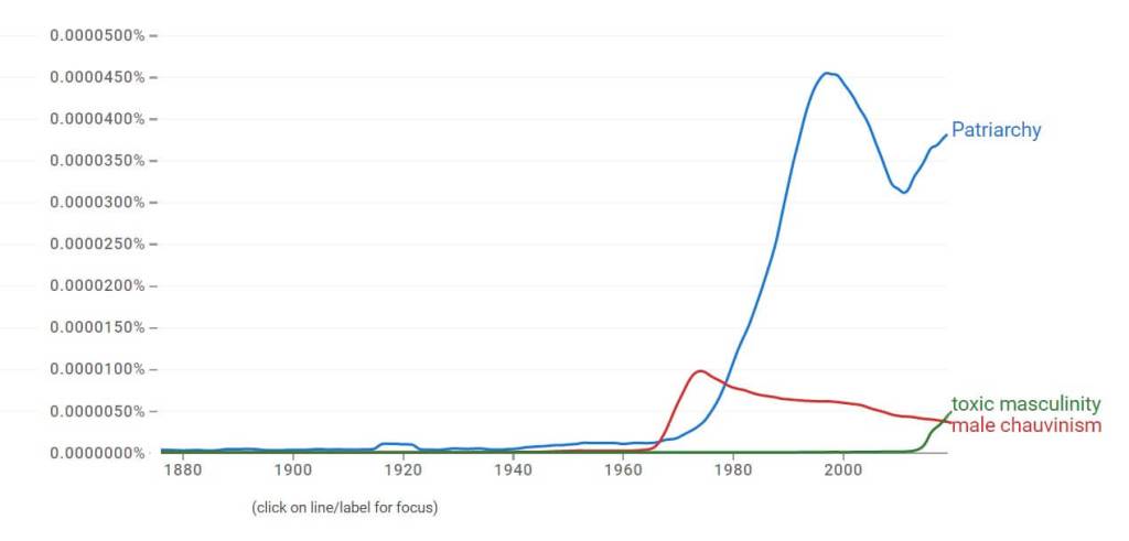 As a concept, ‘the patriarchy’ is new and very much on-trend. Matches using tools such as Ngram Viewer have shown an explosion in the use of the term since the 1960s – see figure below,