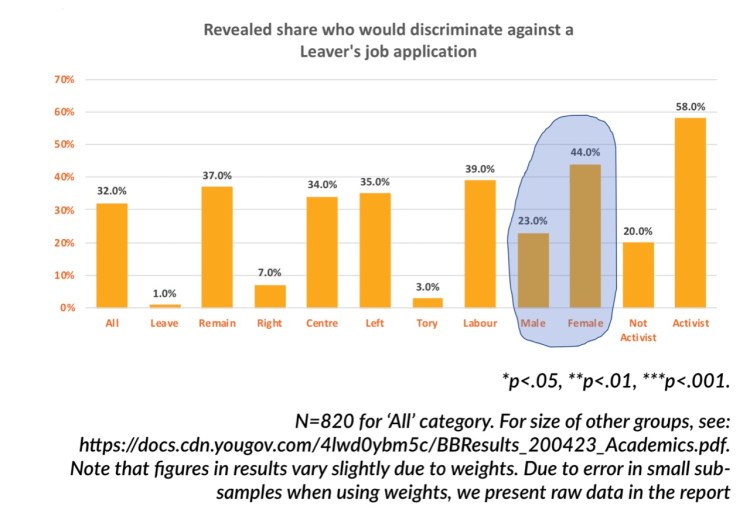A report published in the UK by Policy Exchange (Academic Freedom In The UK) showed a worrying state of affairs in academia where those with centre or right of centre views were hesitant about speaking out and were having to self-censor. Less commented upon was that female academics were more willing to allow their activism to interfere with their professional duty of impartiality and were almost two times more likely than their male peers to discriminate against an equivalently qualified job applicant with different political views – see figure below.