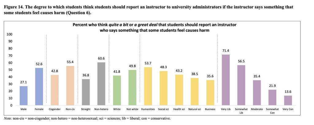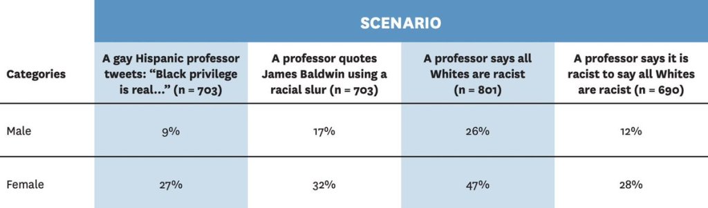 Once again, a study published by the University of Wisconsin in February this year, this time looking at Student Views on Freedom of Speech, found the same pattern. Female students were twice as likely as their male counterparts to believe than instructor should be reported for saying something controversial.