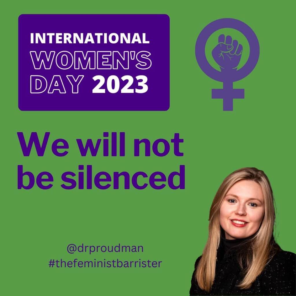 Men should respect. International Women’s Day and men should expect the same from women on International Men’s Day. That does not mean, however, that we are obliged to agree with every sentiment expressed during IWD. For example, the slogan on the left tweeted by feminist barrister Charlotte Proudman is something we could take issue with. Charlotte, it seems, likes posting feminist slogans as much as she likes posting pictures of herself. The aim of the slogan is to give the impression that, in some way least, women’s voices are being silenced. In western countries, at least, nothing could be further from the truth. In most of academia, the media and NGOs it is almost exclusively the feminist voice that is heard. In one sense, I might agree with Ms Proudman, in that only a minority of women identify as feminist, as few as 7% according to survey conducted by the Fawcett Society. Yet, that sceptical female voice that doubts feminist orthodoxy, is rarely heard. However I don’t imagine for one moment that is the kind of silencing Ms Proudman meant.