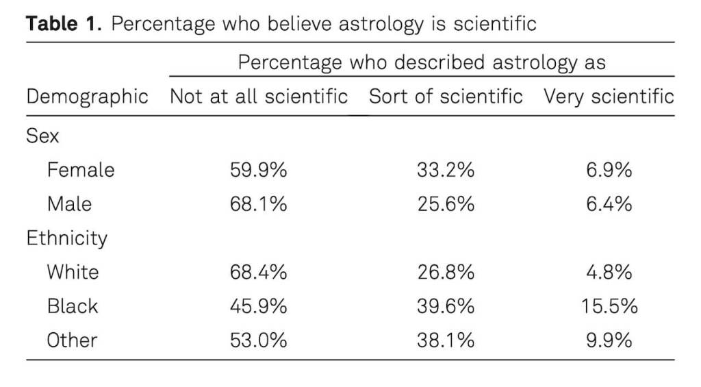 Despite this, and numerous other studies, belief in astrology is surprisingly common. Where it gets interesting, however, are the risk factors for a belief in the predictive powers of astrology? There are two useful studies looking at this issue here and here and they reach similar conclusions. The predictors for a belief in astrology are low intelligence, narcissism and (wait for it) gender. Women are more likely than their male peers to believe that an external locus of control, the position of the planets, influences their lives.