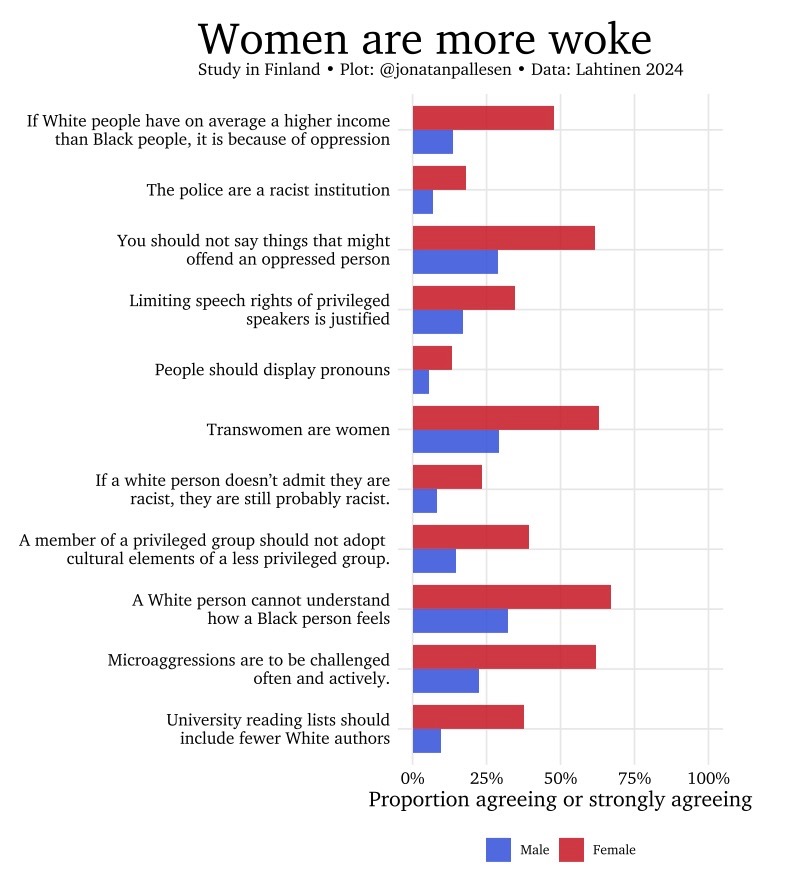 A key plank of CSJ ideology is a belief in invisible systems of power (or external loci of control) that permeate society like the Holy Ghost. These systems of power, according to CSJ advocates, include patriarchy, white supremacy and heteronormativity. Several studies have shown that these belief systems are more attractive to women than men and these differences are large (see here). As with astrology, for example, belief in these power systems also correlates with grandiosity and narcissism see here and here.