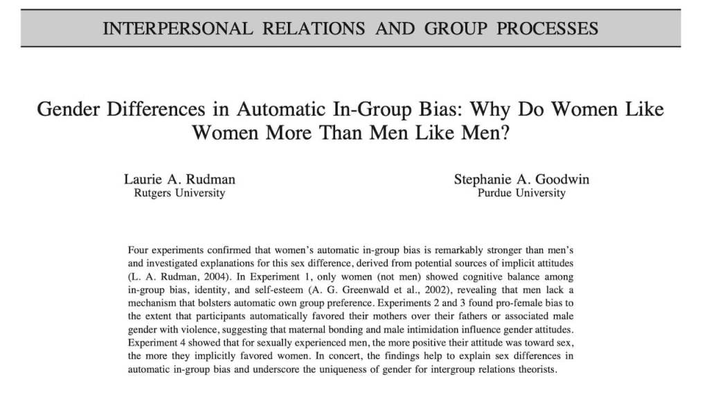 ‘One particularly puzzling aspect of academic and public dialogue about implicit prejudice research has been the dearth of attention paid to the finding that men usually do not exhibit implicit sexism while women do show pro-female implicit attitudes‘
